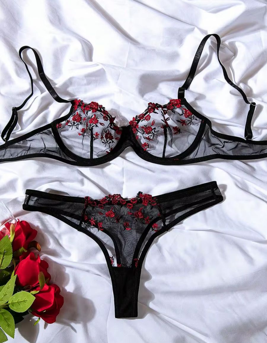 eductor, elegante y con un toque salvaje. El conjunto Rosa Negra mezcla tul negro con bordados florales en rojo profundo que despiertan el deseo y elevan la confianza. Es perfecto para quienes aman el equilibrio entre lo fino y lo atrevido.